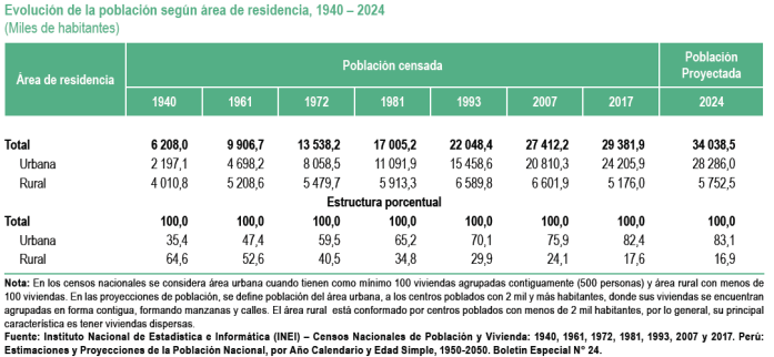 Los mineros informales, son campesinos, mayormente, de zonas andinas que optan por la minería porque es lo que está más a la mano, sin descuidar la chacra ni a los animales caseros. La población rural sigue aumentando en número, aunque en porcentaje la migración ha hecho crecer la población urbana desproporcionadamente. Pero el desequilibrio entre el campo y la ciudad es cada día mayor como consecuencia del desbalance estructural. Todo desequilibrio es dañino. El siguiente cuadro oficial y gráfico demuestra lo dicho.