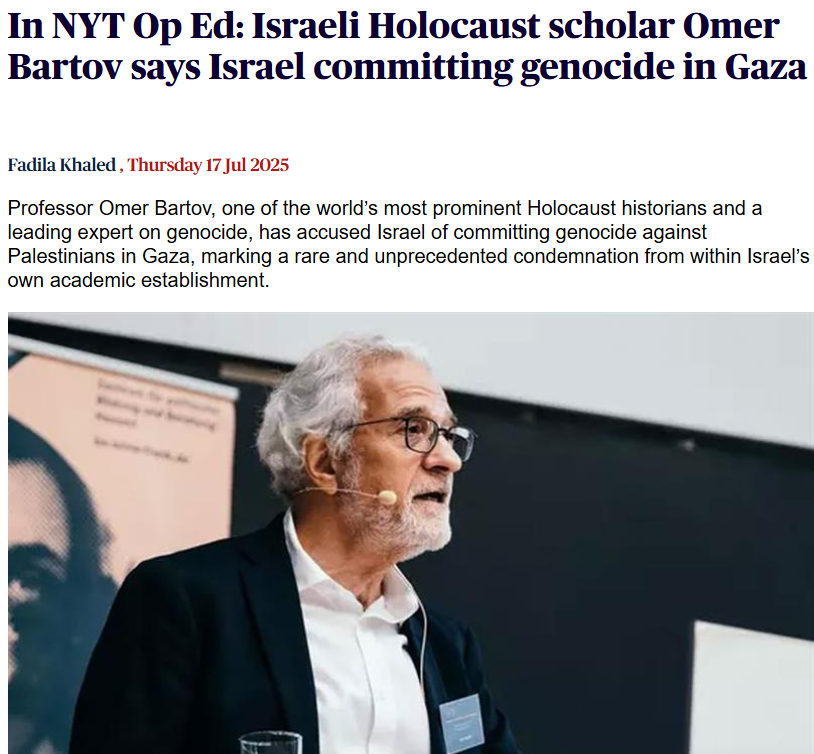 En un artículo de opinión publicado el martes 15 julio en The New York Times, Bartov, un profesor de la Universidad Brown nacido en Israel que ha pasado más de dos décadas investigando el Holocausto, la limpieza étnica y la violencia masiva, escribió: