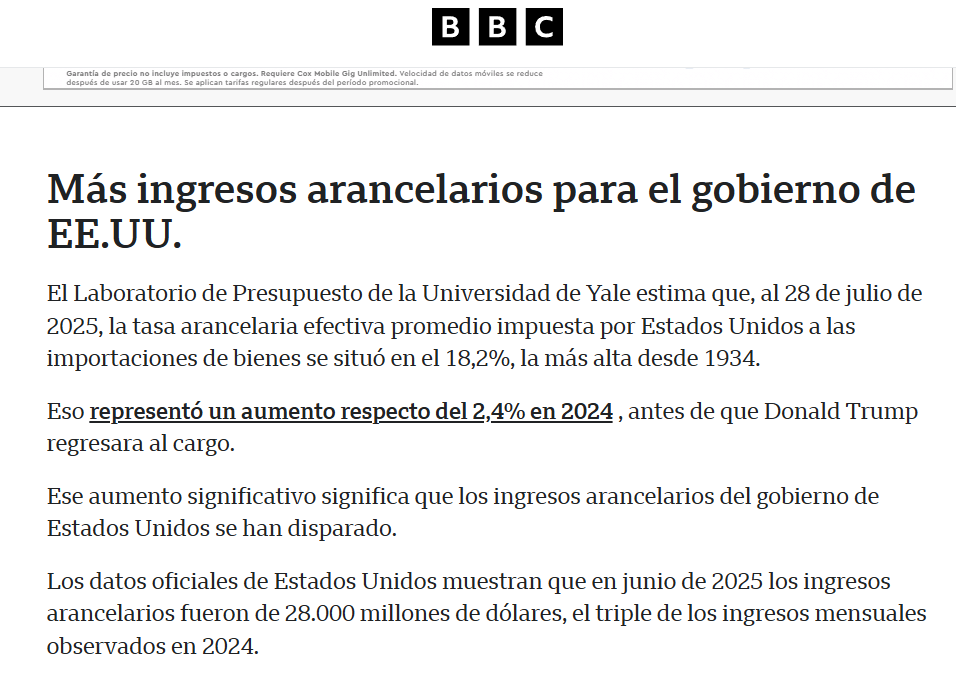 Los aranceles han llevado la tasa efectiva promedio de EE.UU. al nivel más alto desde los años 30, provocando una inflación significativa especialmente en bienes importados: alimentos, ropa, electrodomésticos y tecnología. Se estima que el aumento de precios por los aranceles ya agregó cerca de 1.8% a la inflación en el corto plazo.