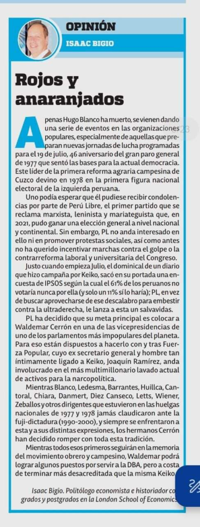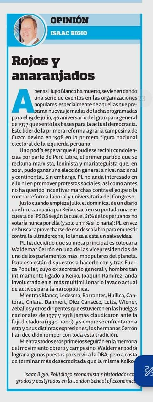 Tampoco es cierto que el histórico paro nacional del 19 de julio de 1977 sentó las bases de esta «democracia» que no es del pueblo y sostiene el modelo neoliberal. No señor Bigio, el paro nacional fue contra la dictadura de Morales Bermúdez y sus paquetes de medidas económicas fondomonetaristas, la reposición de los despedidos desde 1976 con el DS 011-76 y ni siquiera en su plataforma de lucha estaba la Asamblea Constituyente.