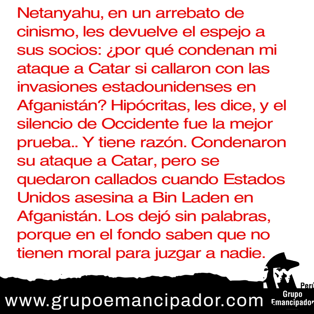 Netanyahu, con una sonrisa de ácido, les suelta a sus “aliados” occidentales: “¿Hipócritas? ¡Claro que lo son!”. Les recuerda que condenaron su ataque a Catar, pero callaron cuando EEUU arrasó Afganistán. Y ahí quedaron: mudos. Porque la verdad, cuando pica, no se puede ignorar… aunque uno quiera.