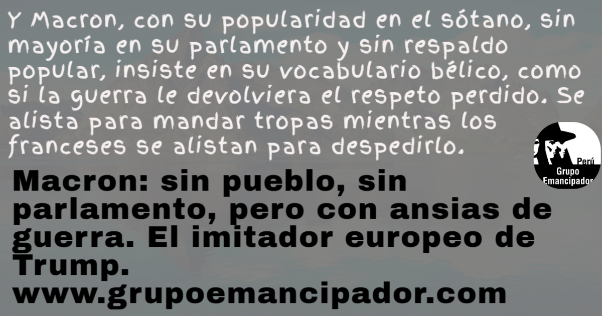 Macron, con su parlamento en rebeldía y su popularidad en picada, se viste de general y habla como si fuera Trump en campaña. ¿Manda tropas? Quizá. ¿O solo ensaya su discurso de despedida? Francia lo rechaza, su gobierno lo ignora, pero él sigue con su vocabulario bélico… porque cuando no tienes poder, al menos tienes ruido.