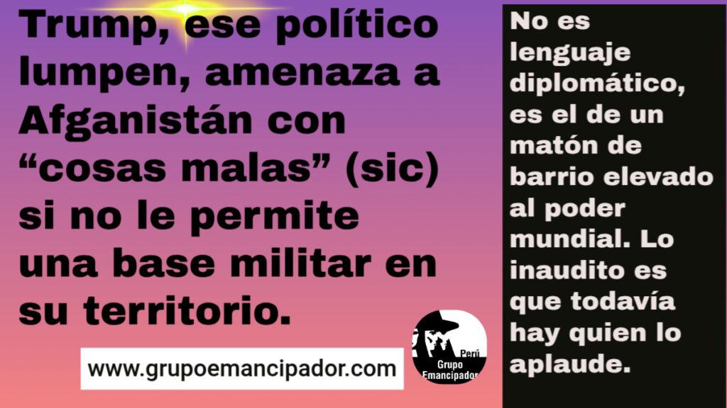 Trump, el matón de barrio convertido en estratega global, le advierte a Afganistán: “Si no dejas que ponga mi ejército en tu casa, te pasará algo malo”. ¿Amenaza? No, es “negociación directa”. El lumpen llegó a la Casa Blanca… y parece que nadie tiene el valor de echarlo.